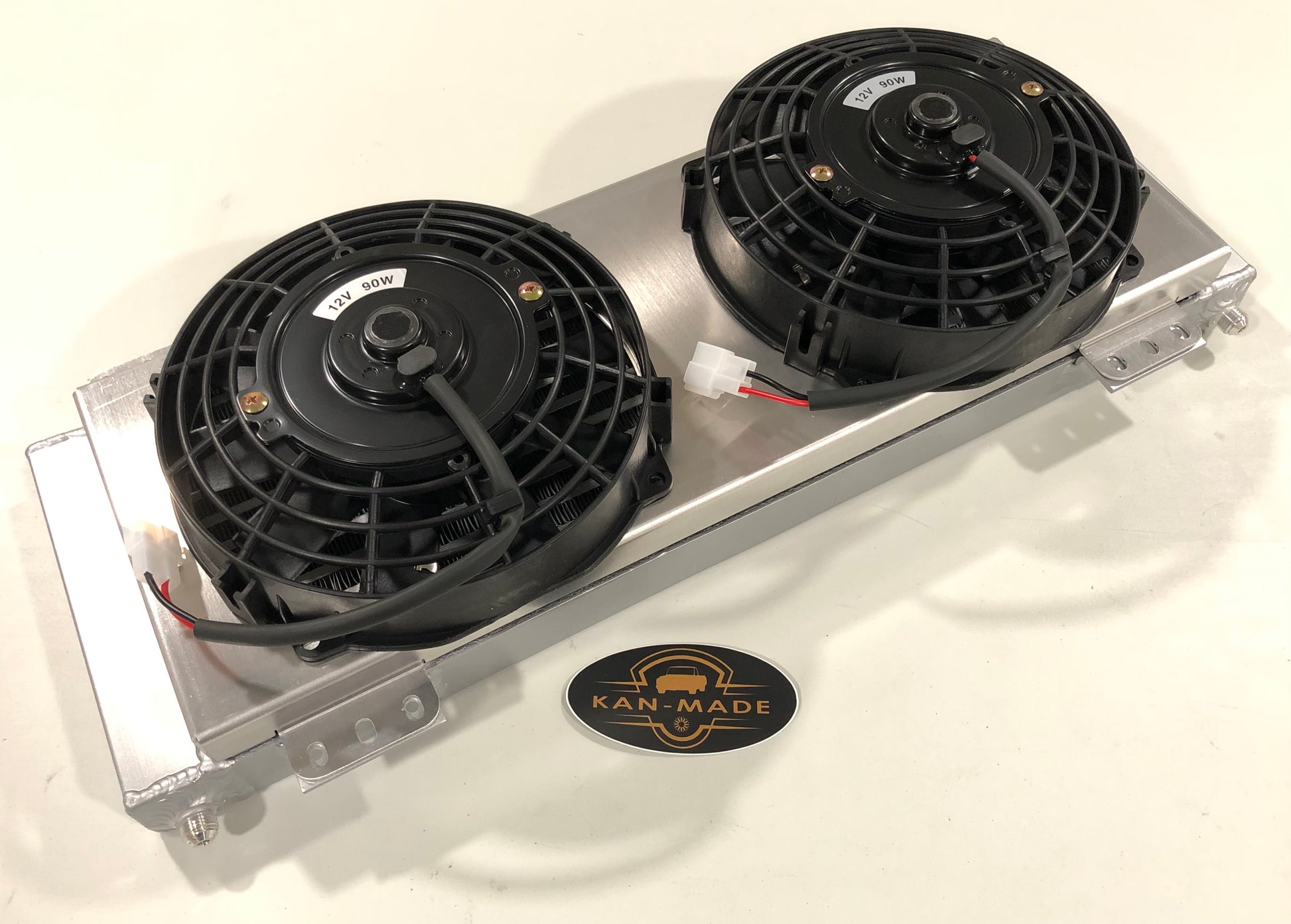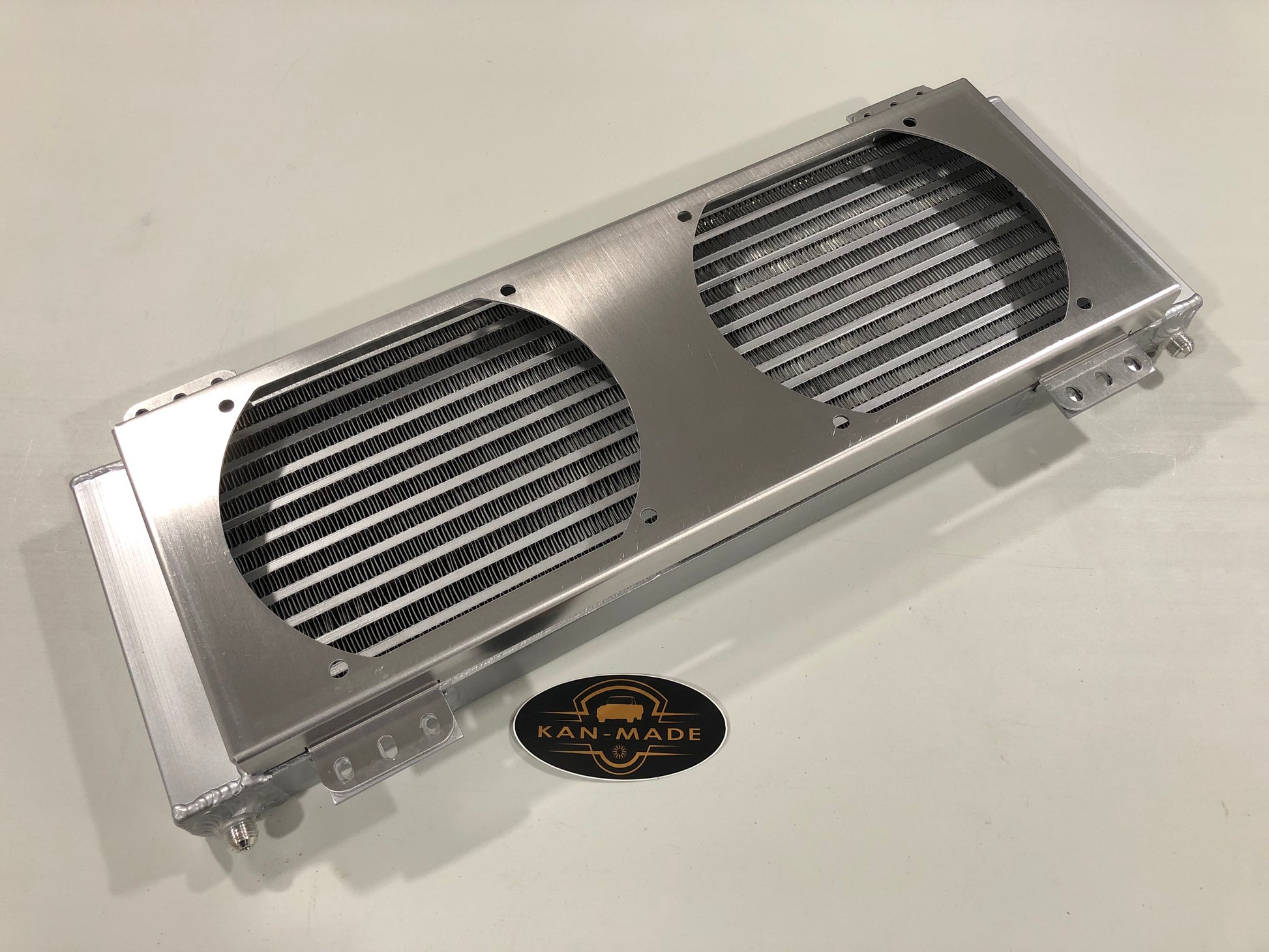 Transmission cooler kit including Huron Speed Silver Series transmission cooler, dual fan shroud, and two 8" electric fans. The Huron Speed transmission cooler is a direct replacement for the Tru-Cool 40k, but is even more efficient and includes welded 6an male fittings.